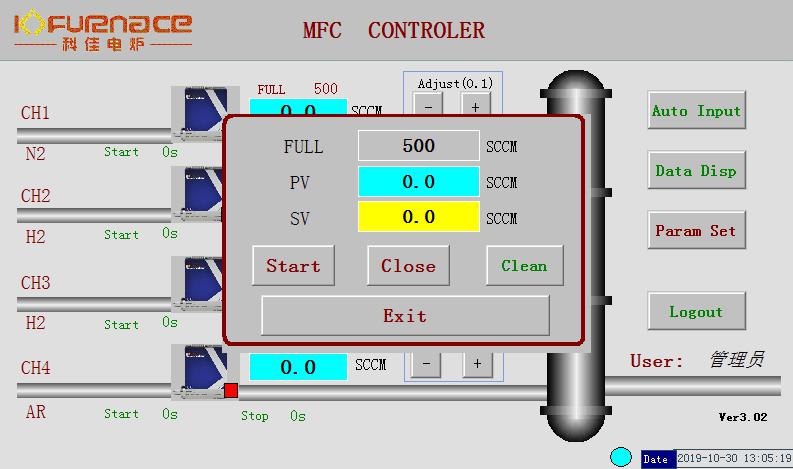 六個(gè)精密質(zhì)量流量計(jì):mGL管式爐|箱式爐|氣氛爐|真空爐|真空燒結(jié)爐|真空釬焊爐-鄭州科佳電爐 MFC精度為:±1.5%F.S。mGL管式爐|箱式爐|氣氛爐|真空爐|真空燒結(jié)爐|真空釬焊爐-鄭州科佳電爐 MFC1 氬氣:氣體流量范圍取決于客戶的要求mGL管式爐|箱式爐|氣氛爐|真空爐|真空燒結(jié)爐|真空釬焊爐-鄭州科佳電爐 MFC2 氮?dú)猓簹怏w流量范圍取決于客戶的要求mGL管式爐|箱式爐|氣氛爐|真空爐|真空燒結(jié)爐|真空釬焊爐-鄭州科佳電爐 MFC3 氧氣:氣體流量范圍取決于客戶的要求mGL管式爐|箱式爐|氣氛爐|真空爐|真空燒結(jié)爐|真空釬焊爐-鄭州科佳電爐 MFC4 二氫化二碳:氣體流量范圍取決于客戶的要求mGL管式爐|箱式爐|氣氛爐|真空爐|真空燒結(jié)爐|真空釬焊爐-鄭州科佳電爐 MFC5 甲烷:氣體流量范圍取決于客戶的要求mGL管式爐|箱式爐|氣氛爐|真空爐|真空燒結(jié)爐|真空釬焊爐-鄭州科佳電爐 MFC6 氫氣:氣體流量范圍取決于客戶的要求mGL管式爐|箱式爐|氣氛爐|真空爐|真空燒結(jié)爐|真空釬焊爐-鄭州科佳電爐 (以上流量范圍僅供參考,請(qǐng)?jiān)谟嗁徢按_認(rèn)氣體流量范圍。)mGL管式爐|箱式爐|氣氛爐|真空爐|真空燒結(jié)爐|真空釬焊爐-鄭州科佳電爐 底殼上安裝了一個(gè)氣體混合罐,底殼左側(cè)安裝了6個(gè)不銹鋼針閥,用于手動(dòng)控制6種類型的氣體混合。mGL管式爐|箱式爐|氣氛爐|真空爐|真空燒結(jié)爐|真空釬焊爐-鄭州科佳電爐 MFC的液晶觸摸屏(由科佳設(shè)計(jì),帶有科佳標(biāo)志)如下:mGL管式爐|箱式爐|氣氛爐|真空爐|真空燒結(jié)爐|真空釬焊爐-鄭州科佳電爐